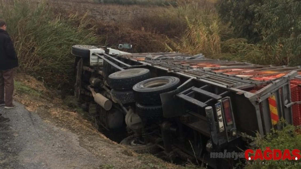 Mersin’in Tarsus ilçesinde yoldan çıkan kamyon devrildi.