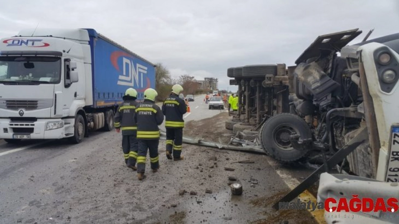 Kontrolden çıkan kamyon, demir bariyerlere çarptıktan sonra devrildi. Hafif yaralanan kamyon sürücüsü Demirelli, sağlık ekiplerince Trakya Üniversitesi Tıp Fakültesi Hastanesine kaldırıldı.