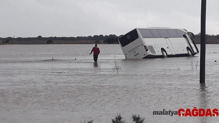 Antalya'da iki gündür etkili olan yağışlar sebebiyle bir tur otobüsü şoförü, sular altında kalan yolda yönünü kaybetmesi sonucu suyla kaplı tarlaya saplanıp mahsur kaldı.