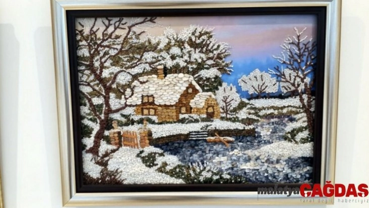 Mudanya Halk Eğitim Merkezi (HEM) Çağrışan hizmet binasında eğitim alan 'doğal taşlardan tablo yapım sanatı' kursiyerleri, Tayyare Kültür Merkezi'nde sergi açtı.