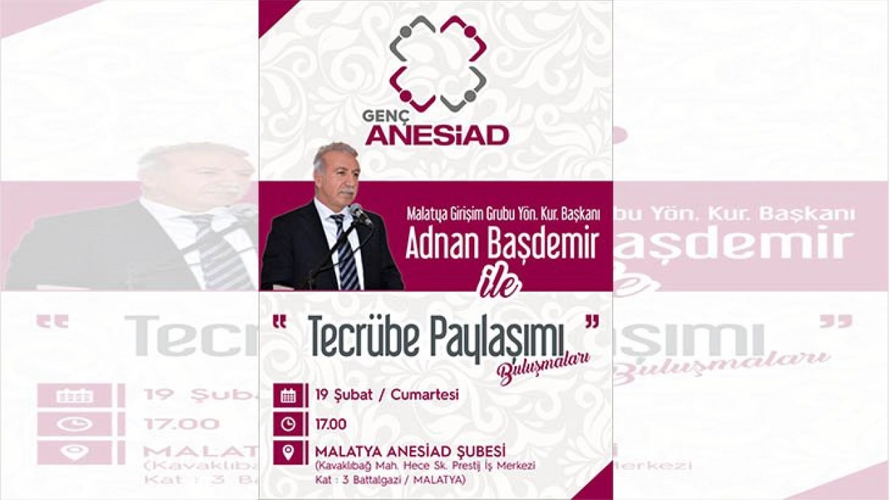 Anadolu Esnaf Sanayici ve İş Adamları Derneği (ANESİAD) tarafından düzenlenen 'Tecrübe Paylaşım Buluşmalarının' konuğu Malatya Girişim Grubu Yönetim Kurulu Başkanı Adnan Başdemir oluyor.