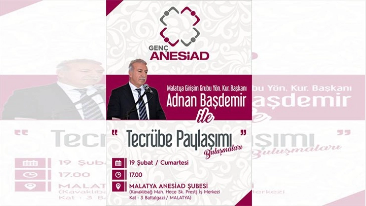 Genç ANESİAD tarafından düzenelenen "Tecrübe Paylaşım Buluşmalarının" konuğu Malatya Girişim Grubu Yönetim Kurulu Başkanı Adnan Başdemir olacak. 19 Şubat Cumartesi saat 17'de düzenlenecek. Kendi tecrübelerini paylaşacak olan Başdemir'in konuk olduğu buluşma ANESİAD Malatya şube binasında gerçekleşecek.