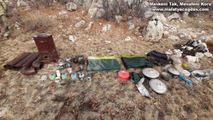 Malatya'da, terör örgütü mensuplarının 6-7 yıl önce kullandıkları, kayaların arasına gizlenmiş şekilde çeşitli yaşam malzemeleri ele geçirildi.