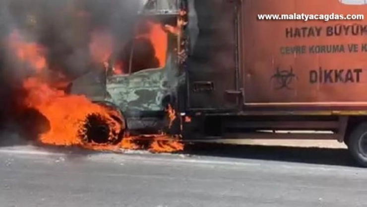Hatay’da seyir halinde motor bölümünden alev alan tıbbi atık toplama kamyonu yandı.