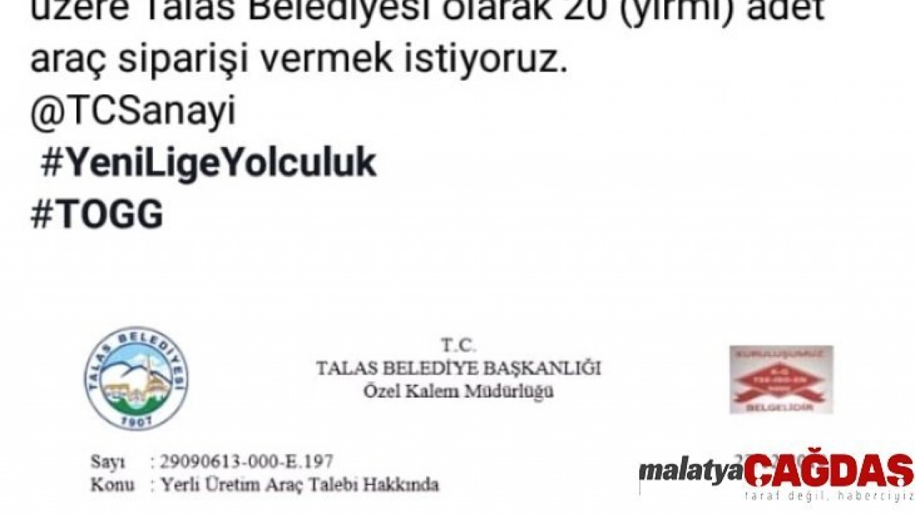 Talas Belediye Başkanı Mustafa Yalçın, sosyal medya hesabından yaptığı açıklamada, "Talas Belediyesi olarak yerli ve milli TOGG marka araçların ülkemize ve milletimize hayırlı uğurlu olmasını diliyoruz. Belediyemizin hizmetlerinde kullanmak üzere 20 adet araç sipariş vermek istiyoruz" dedi.