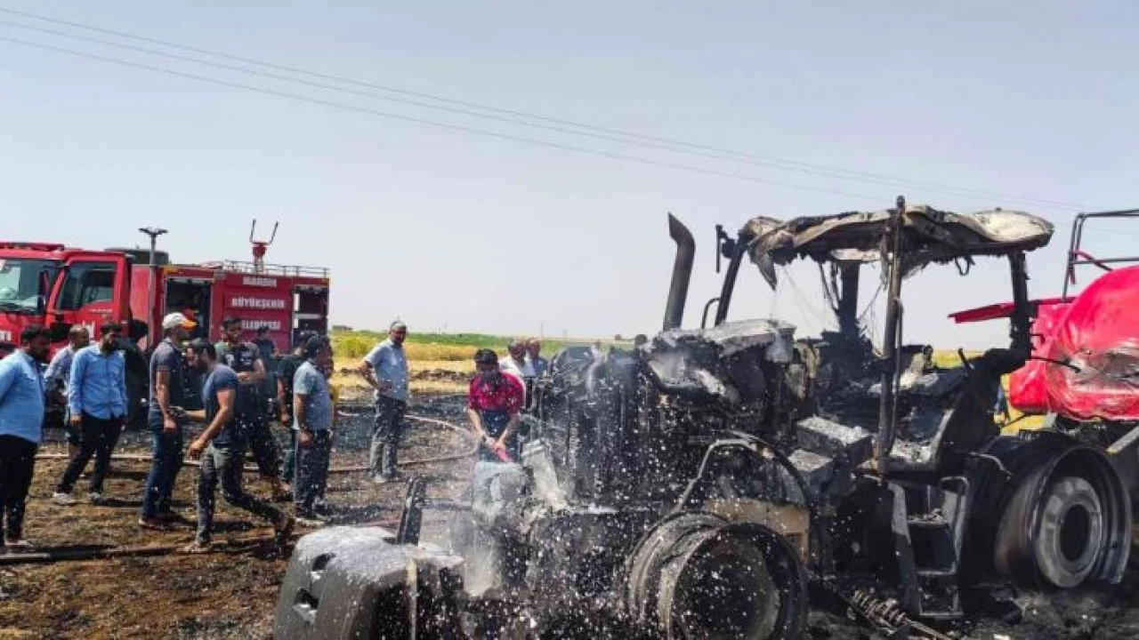Mardin'in Derik ilçesinde bir traktörle birlikte 50 dönüm buğday tarlası yandı.