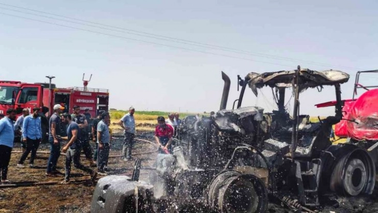 Mardin’in Derik ilçesinde bir traktörle birlikte 50 dönüm buğday tarlası yandı.