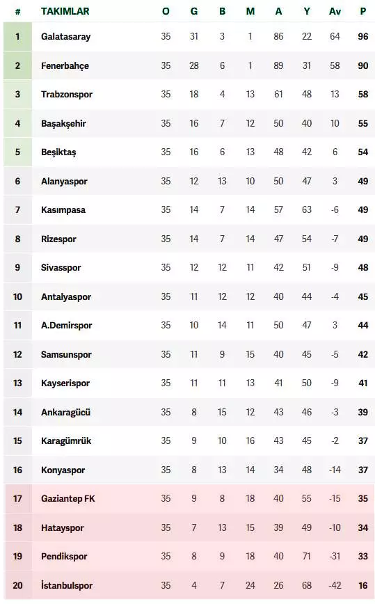 33 puanlı Pendikspor 19'uncu, 34 puanlı Hatayspor 18'inci, 35 puanlı Gaziantep FK ise 17. sırada yer alıyor.