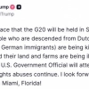 ABD Başkanı Donald Trump, bu yılki G20 Zirvesi'nin Güney Afrika'da yapılacak olmasını tam bir rezalet olarak niteleyerek, İnsan hakları ihlalleri devam ettiği sürece hiçbir ABD hükümet yetkilisi toplantıya katılmayacak açıklamasında bulundu.
