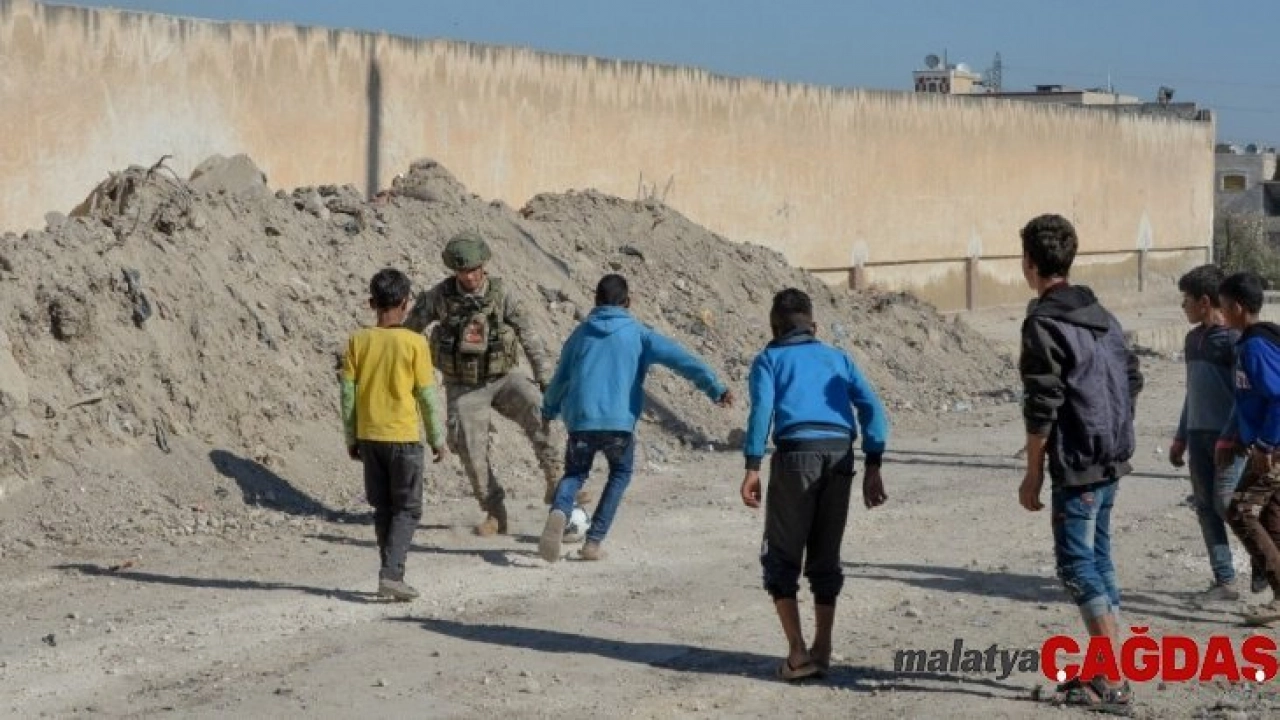 Barış Pınarı Harekatı bölgesinde görev yapan Türk askeri, yaşamın normale döndürülmesi çalışmaları kapsamında, geçirdikleri zor günleri unutmaları için Rasulayn’daki çocukların oyunlarına eşlik etti.