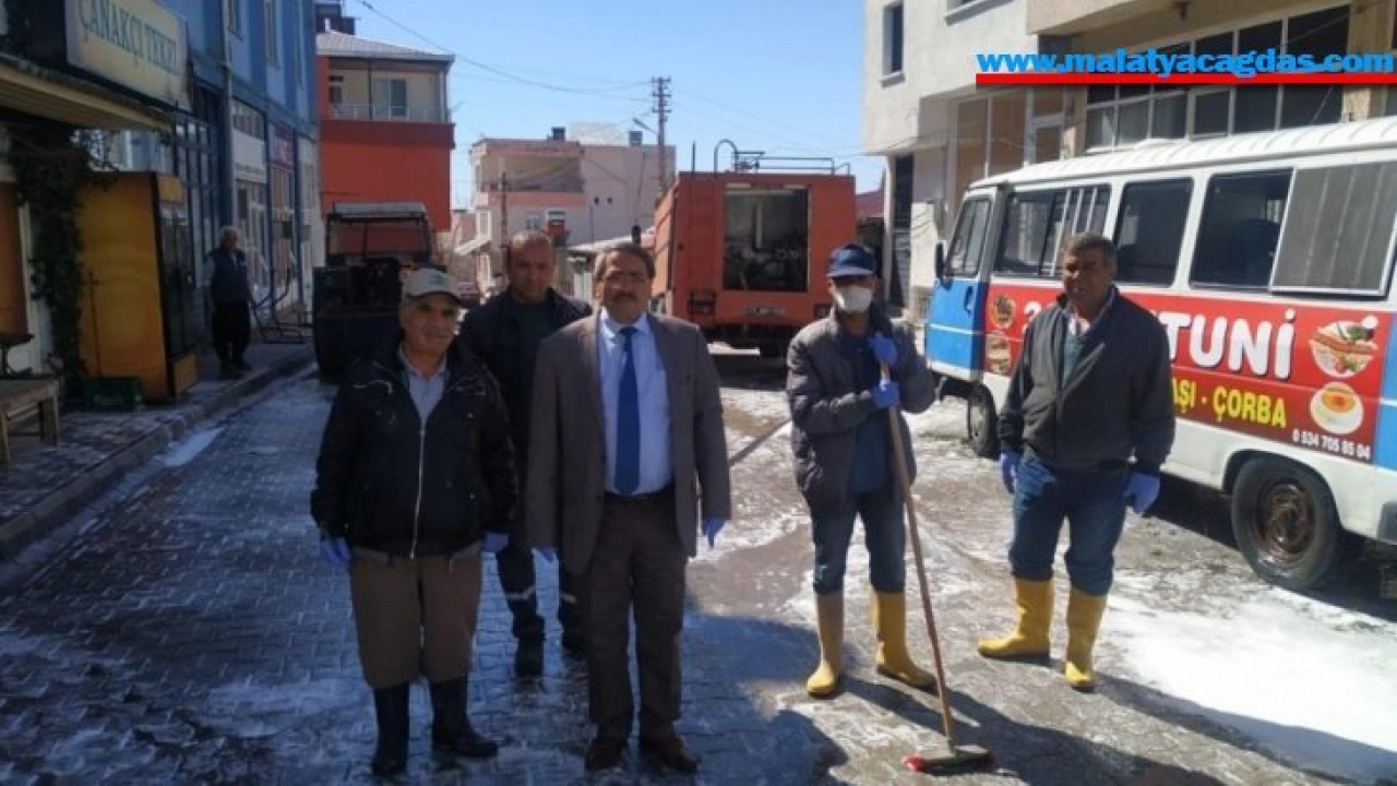 Belediye ekipleri sokak ve caddeleri, kaldırımları köpüklü suyla yıkarken, ilçedeki kamu kurum ve kuruluşlarında dezenfekte işlemini yürüttü.