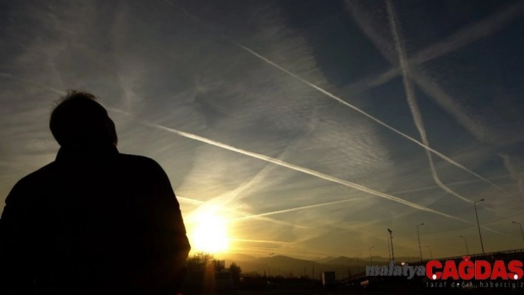 - Uçak izleri ve güneşin batışı görsel şölen oluşturdu
