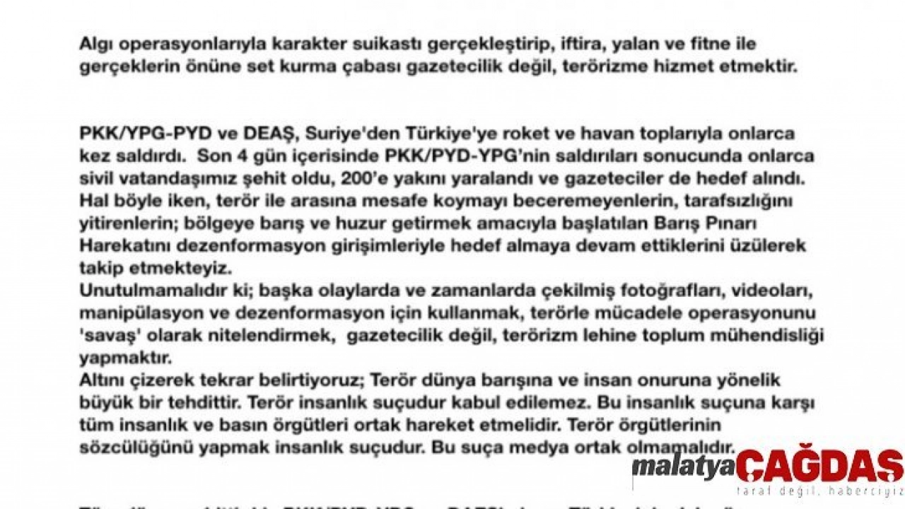 “Sivilleri hedef alan terör, terör örgütleri, işbirlikçileri ve terörizmin sözcülüğünü yapan medyayı kınıyoruz” ifadelerinin yer aldığı mektupta, algı operasyonlarıyla karakter suikastı gerçekleştirip, iftira, yalan ve fitne ile gerçeklerin önüne set kurma çabasının “gazetecilik” değil, “terörizme hizmet etmek” olduğunun altı çizildi.