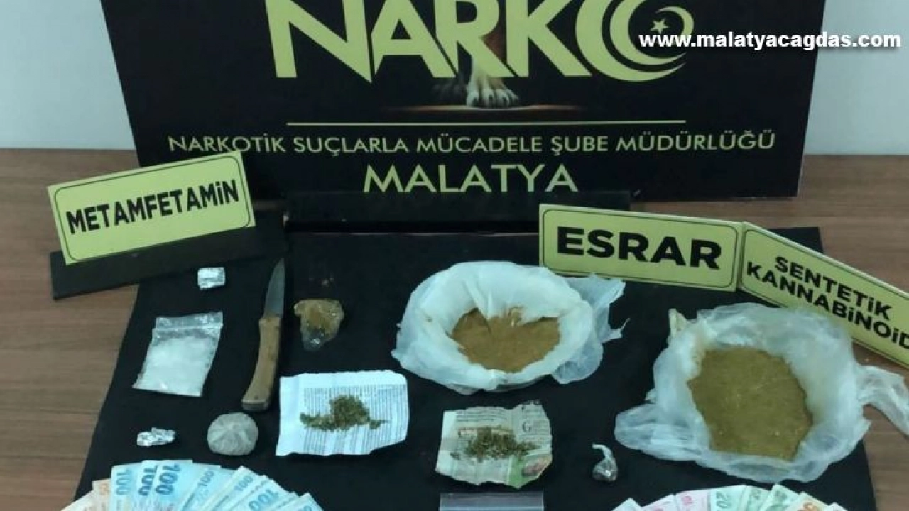 Edinilen bilgiye göre, Malatya Emniyet Müdürlüğü Narkotik Suçlarla Mücadele Şube Müdürlüğü görevlilerince torbacı olarak tabir edilen sokak satıcılarına yönelik çalışmada, 66 gram metamfetamin, 95 gram sentetik kannabinoid, 6 gram esrar, 1 adet ruhsatsız tabanca ve 6 adet fişek,1 adet kesici alet, suçtan elde edildiği değerlendirilen 4 bin 25 TL ele geçirildi. Konu ile ilgili 2 kişi, TCK 188 maddesinden işlem yapıldıktan sonra çıkarıldıkları mahkemece tutuklandı.