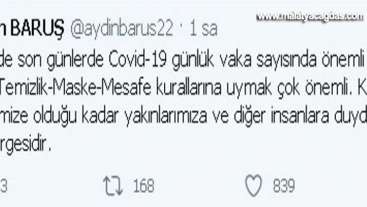 Vali Aydın Baruş, sosyal medya hesabında yaptığı açıklamada, “ İlimizde son günlerde Covid-19 günlük vaka sayısında önemli oranlarda artış var. Temizlik-Maske-Mesafe kurallarına uymak çok önemli. Kurallara riayet kendimize olduğu kadar yakınlarımıza ve diğer insanlara duyduğumuz saygının göstergesidir” dedi.