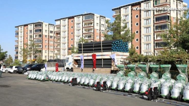 Yapılan konuşmaların ardından Karaloğlu ve beraberindekiler, Kırsal Hizmetler Daire Başkanlığı tarafından hazırlanan proje kapsamında yaklaşık 3 milyon 600 bin Türk Lirası tutarındaki tarımsal makine ve malzemeleri çiftçilere dağıttı. Kırsal Hizmetler Daire Başkanlığı tarafından hazırlanan proje kapsamında 45 bin 540 metre tarımsal sulama borusu, 10 badem soyma makinesi, 10 badem silkeleme makinesi, 20 üzüm pres makinesi, 100 adet süt sağım makinesi ile 4 adet küçük baş hayvan yıkama makinesi dağıtıldı.