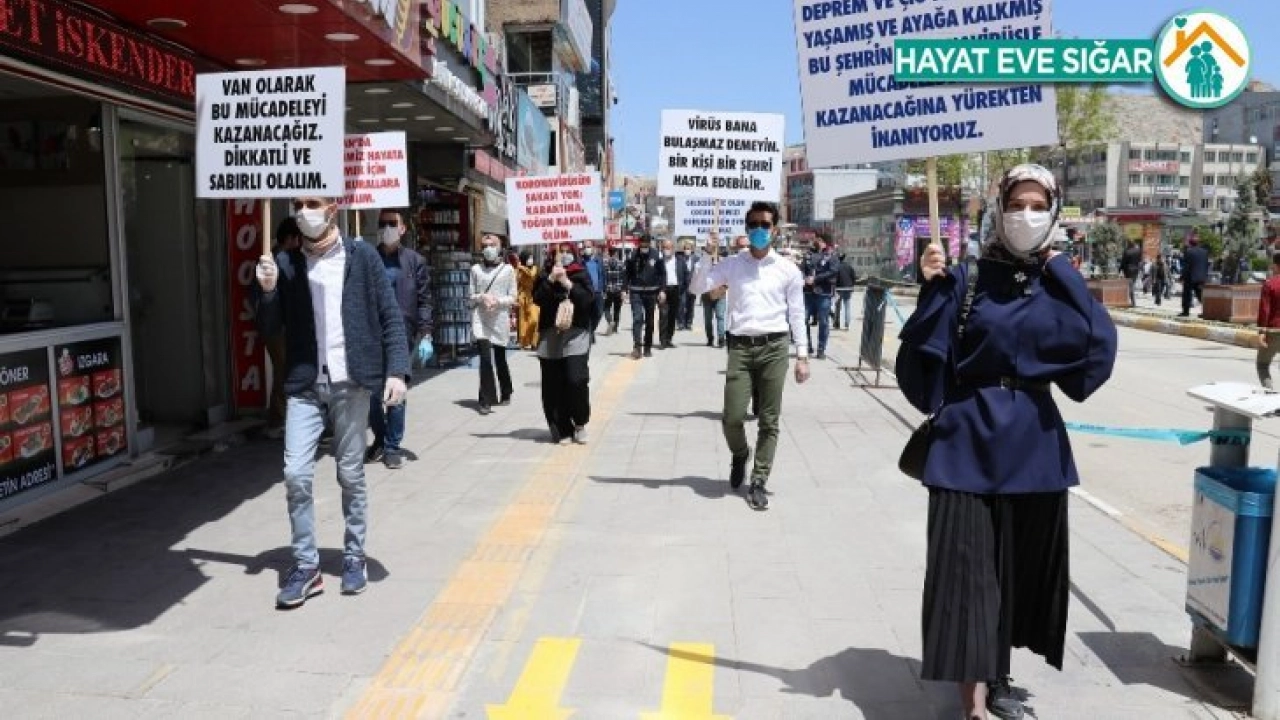 Van YYÜ öğrencileri, korona virüsle mücadelede sosyal mesafenin önemine dikkat çekmek için yürüyüş düzenledi. Van Valiliği önünde düzenlenen yürüyüşe destek veren Van Valisi ve Büyükşehir Belediye Başkan Vekili Mehmet Emin Bilmez, korona virüs salgını ile mücadelenin elbirliğiyle mümkün olduğunu ifade ederek, “Pandemiyle mücadele ettiğimiz bu zor günlerde her zamankinden daha çok kenetlenmeye ihtiyacımız var. Van YYÜ öğrencileri, bu manada bir sosyal sorumluluk projesi ile bu sürece çok kıymetli bir destek veriyorlar. Hazırlamış oldukları broşür ve dövizlerle, hemşehrilerimizin bu sürece yönelik farkındalıklarını canlı tutmak için şehir merkezinde bir sosyal sorumluluk projesi başlatıyorlar. Geçmişimiz olan büyüklerimizi ve geleceğimiz olan çocuklarımızı korumak adına verilen bu mücadelede, Van Yüzüncü Yıl Üniversitesi öğrencilere destek olmak için buradayız” dedi.