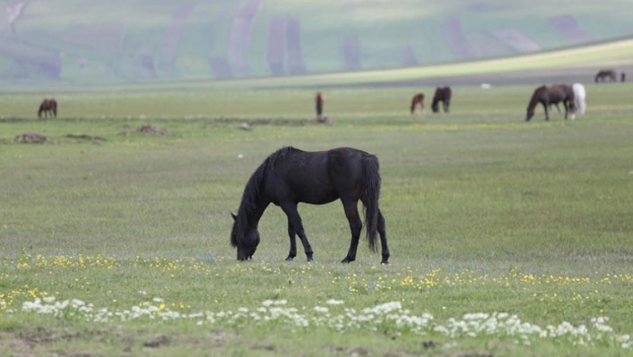 Kars'ın yeşeren doğasında yılkı atları görüntülendi