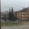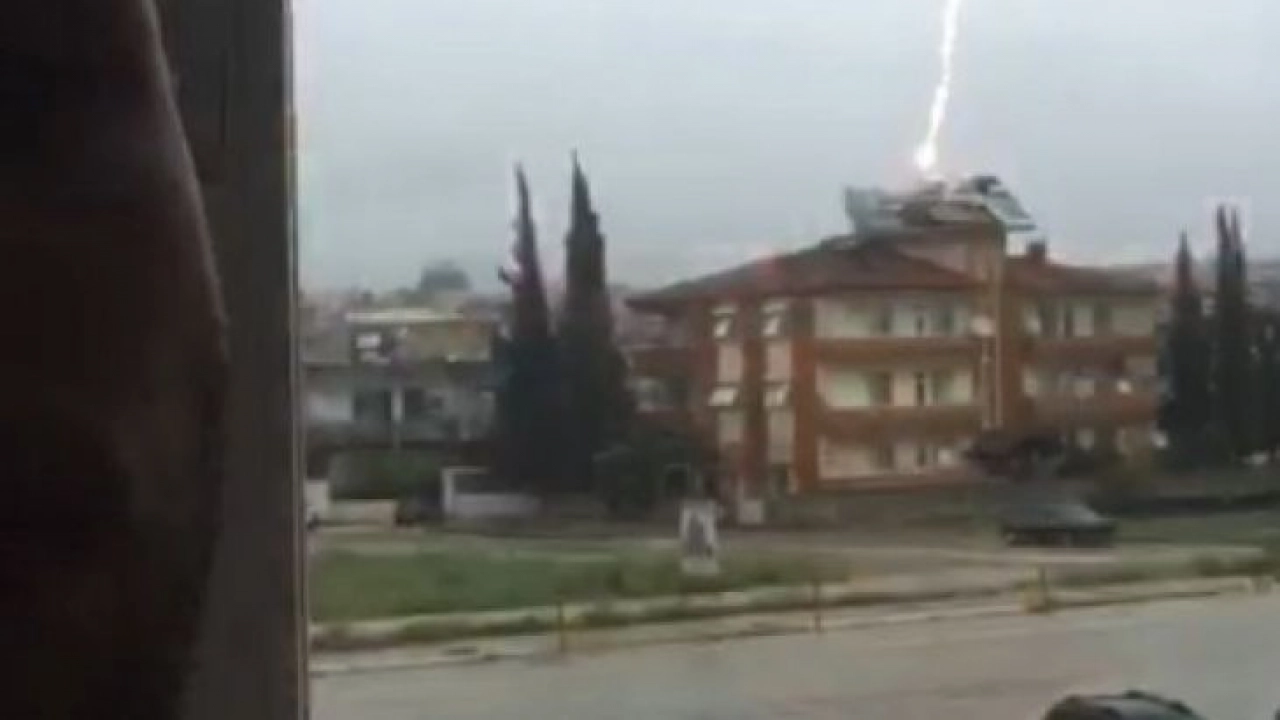 Hatay'ın Antakya ilçesinde bir gencin, sağanak yağmuru ve şimşekleri videoya çektiği anlarda bir binanın üzerine yıldırım düştü.