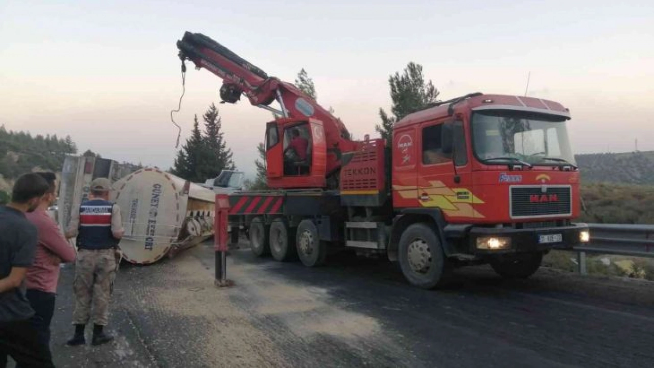 Hatay'ın Belen ilçesinde Çakallı mevkiinde devrilen tanker trafiği kapattı. İki şeritli yolda geçişler saatlerce tamamen durdu.