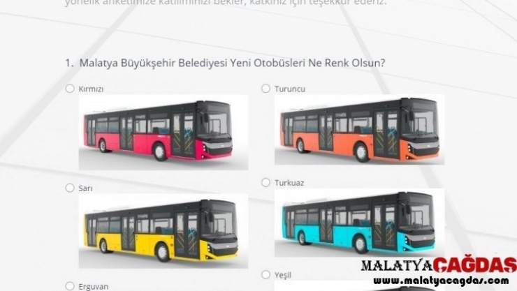 Malatyalılar, toplu taşımada hangi renk otobüs görmek istediklerini Büyükşehir Belediyesinin www.malatya.bel.tr isimli web sitesinde düzenlenen “yeni belediye otobüslerimizin hangi renk olmasını istersiniz’ sütununda yer alan ankete katılarak belirleyebilecekler.