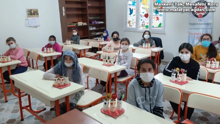 Diyarbakır merkez Yenişehir İlçe Belediyesi Aile Destek Merkezi’nde (ADEM) eğitim gören kursiyerlerin çocukları atık materyallerden kalemlik yapıyor.