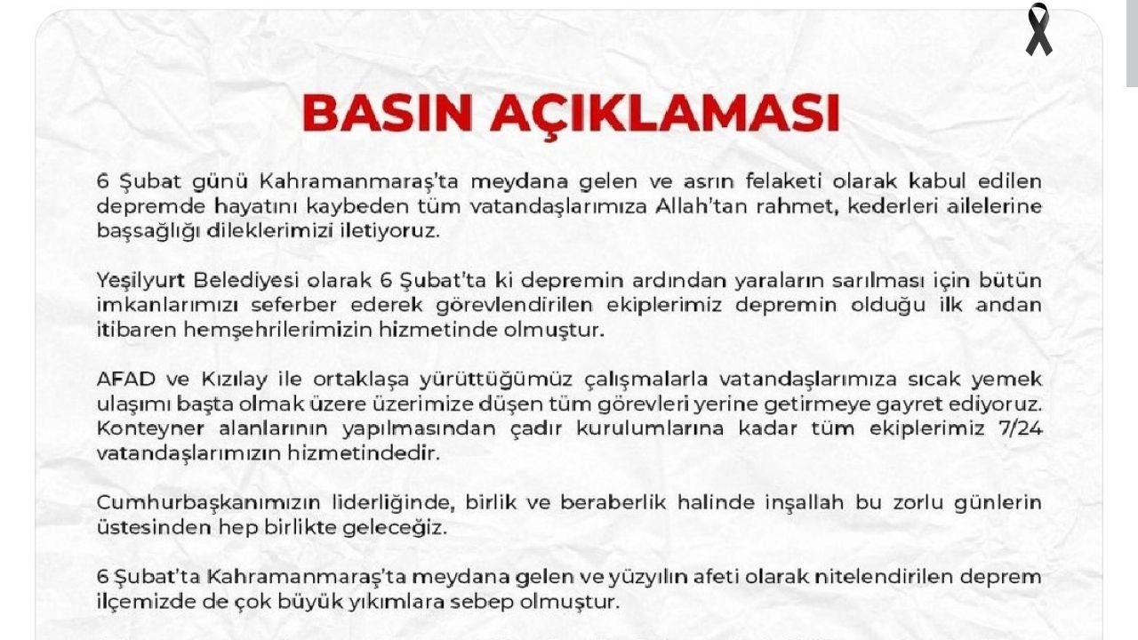 6 Şubat günü Kahramanmaraş’ta meydana gelen ve asrın felaketi olarak kabul edilen depremde yaraların sarılması için bütün imkanların seferber edildiğinin belirtildiği açıklamada, "AFAD ve Kızılay ile ortaklaşa yürüttüğümüz çalışmalarla vatandaşlarımıza sıcak yemek ulaşımı başta olmak üzere üzerimize düşen tüm görevleri yerine getirmeye gayret ediyoruz. Konteyner alanlarının yapılmasından çadır kurulumlarına kadar tüm ekiplerimiz 7/24 vatandaşlarımızın hizmetindedir. Cumhurbaşkanımızın liderliğinde, birlik ve beraberlik halinde inşallah bu zorlu günlerin üstesinden hep birlikte geleceğiz" ifadelerine yer verildi.