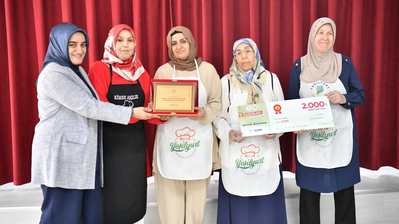 ‘Kadınlar Yarışıyor’ temalı ‘Analı Kızlı Yemek Yarışması’ ödül törenine katılan Malatya Büyükşehir Belediye Başkanı Sami Er’in eşi Sevgi Er, AK Parti İl Başkanı Ali Bakan’ın eşi Feride Bakan, Yeşilyurt Belediye Başkanı Prof. Dr. İlhan Geçit’in eşi Neşe Geçit ile AK Parti İl Kadın Kolları Başkanı Esin Yılmaz ve AK Parti Yeşilyurt İlçe Kadın Kolları Başkanı Yurdanur Mut, dereceye giren kursiyerleri tebrik ederek, ödüllerini verdiler.