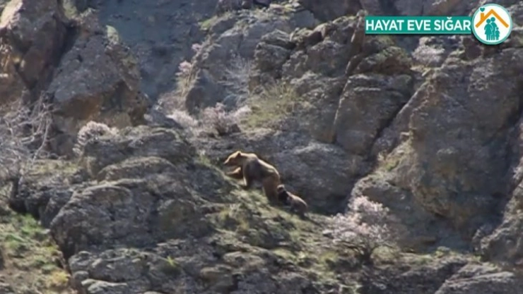 Sivas’ın Divriği ilçesinde yiyecek aramak için köy yakınlarına kadar inen anne ayı ve 2 yavrusu cep telefonuyla görüntülendi. Hayvan sever vatandaşlar tarafından görüntülenen ayı ailesi, bir süre yiyecek aradıktan sonra gözden kayboldu. Bilinçsiz avcılar dolayısı ile ailenin görüldüğü yer ise gizli tutuluyor.